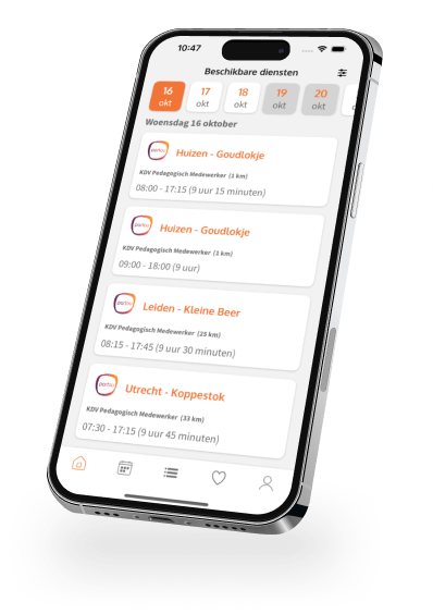 Geen vaste roosters of verplichtingen. Geef via onze app simpelweg door op welke dagen en tijden jij beschikbaar bent.